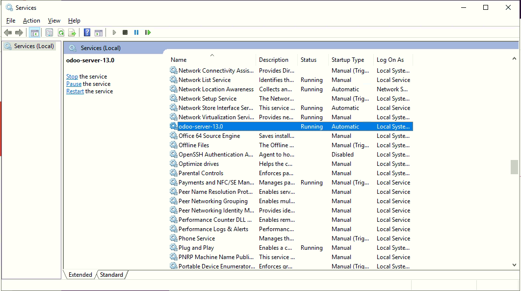 Odoo-server-13.0 is the Odoo service in windows, open the service menu and you can view the window as shown below where you can stop the service and start it again.