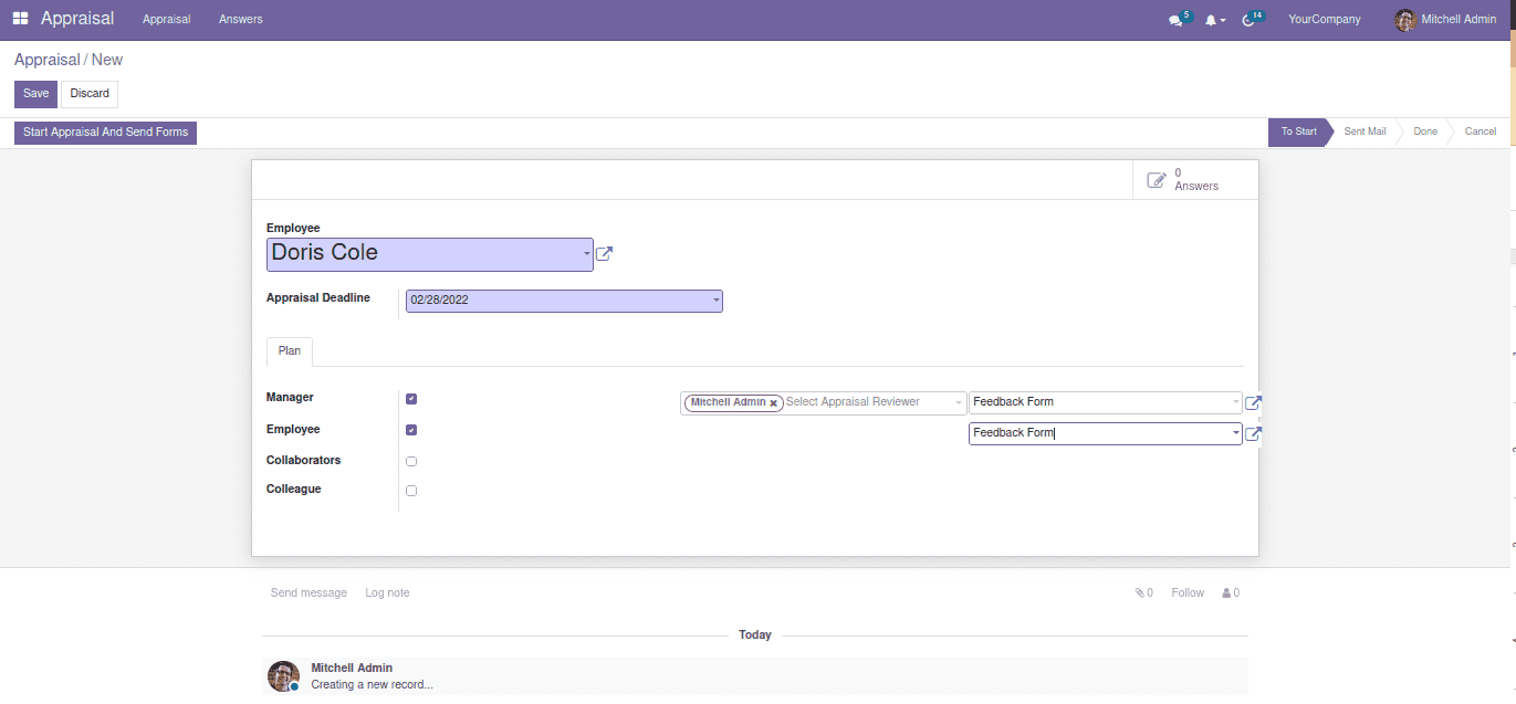 While creating an appraisal, the employee and the deadline of the appraisal are the mandatory fields. From the ‘Plan’ tab, you can select the parties that should be involved in the appraisal. Along with that you can select the opinion form they need to fill during the appraisal. Once you created the appraisal you can click on the ‘Start Appraisal and Send Forms’ button to start the appraisal process.