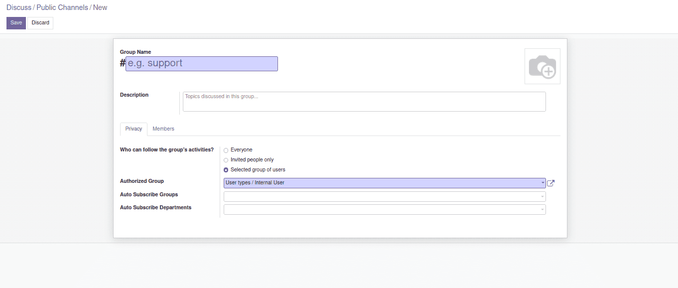 From this screen also, using the create button we can create a new channel with the option to set the privacy and Auto subscribe preferences.
