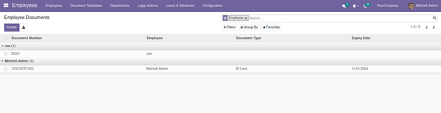 Documents from all of the employees will be listed under the Employees > Employees > Documents menu. It will be grouped by the employees by default.