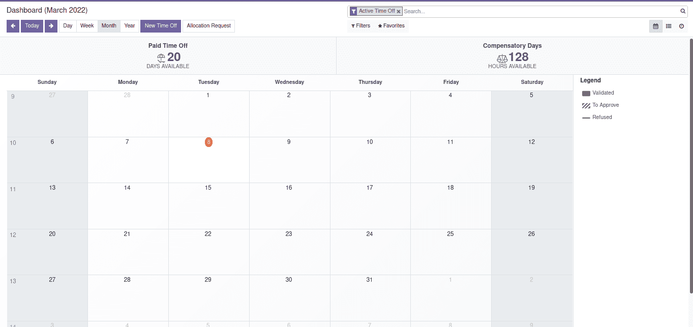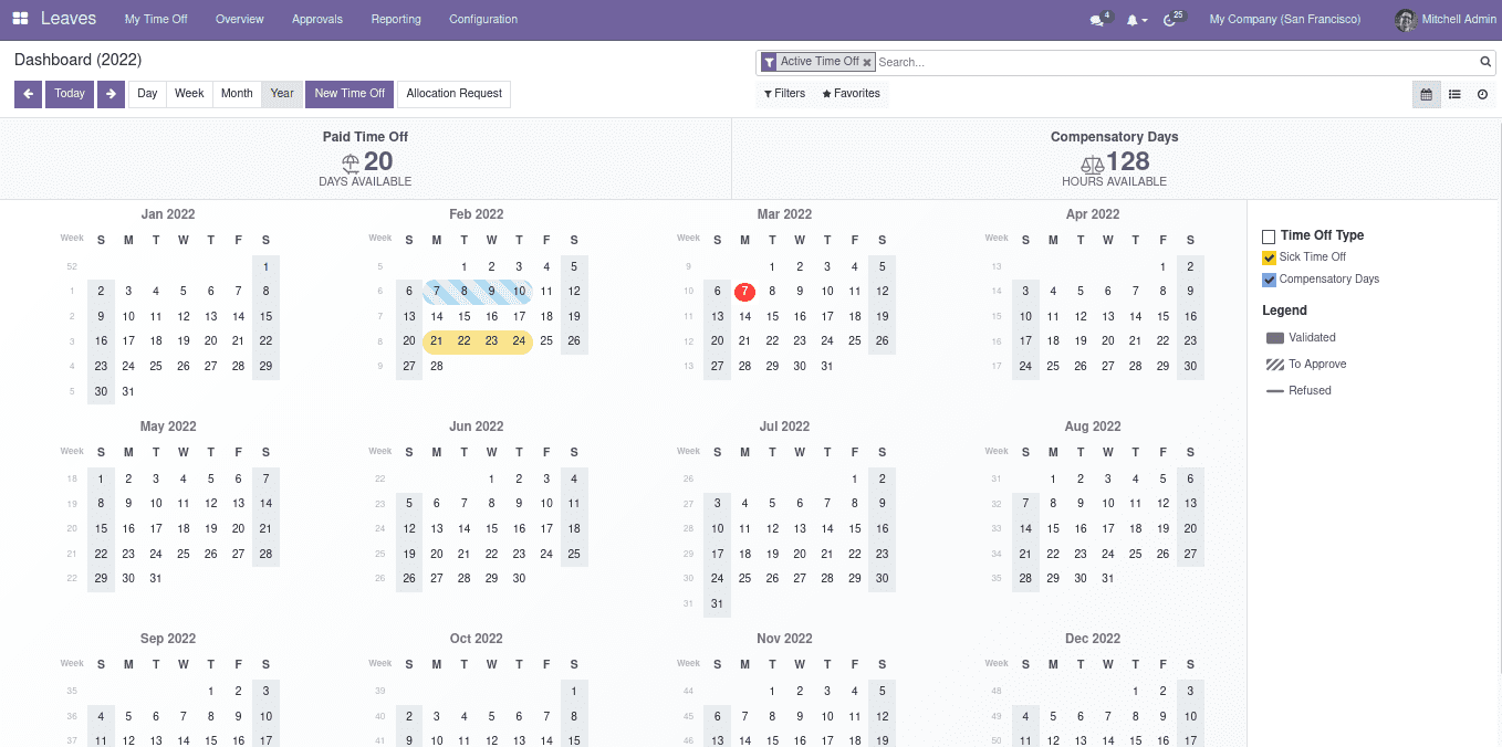 The dashboard brings us the yearly calendar view with all kinds of time offs marked for each month. On the header, we have the available paid time offs and compensatory days displayed. You can also change it to Day, Week, or Month views.