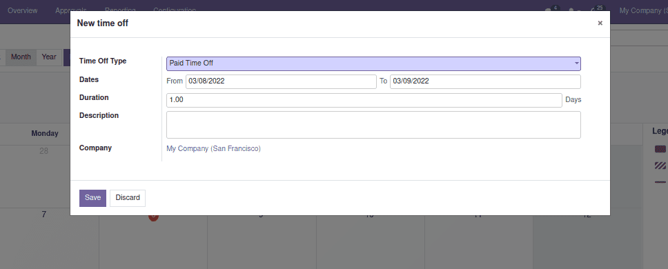 We have to select the Time Off type. We can configure the time-off types from Leaves > Configuration > Time Off Types.