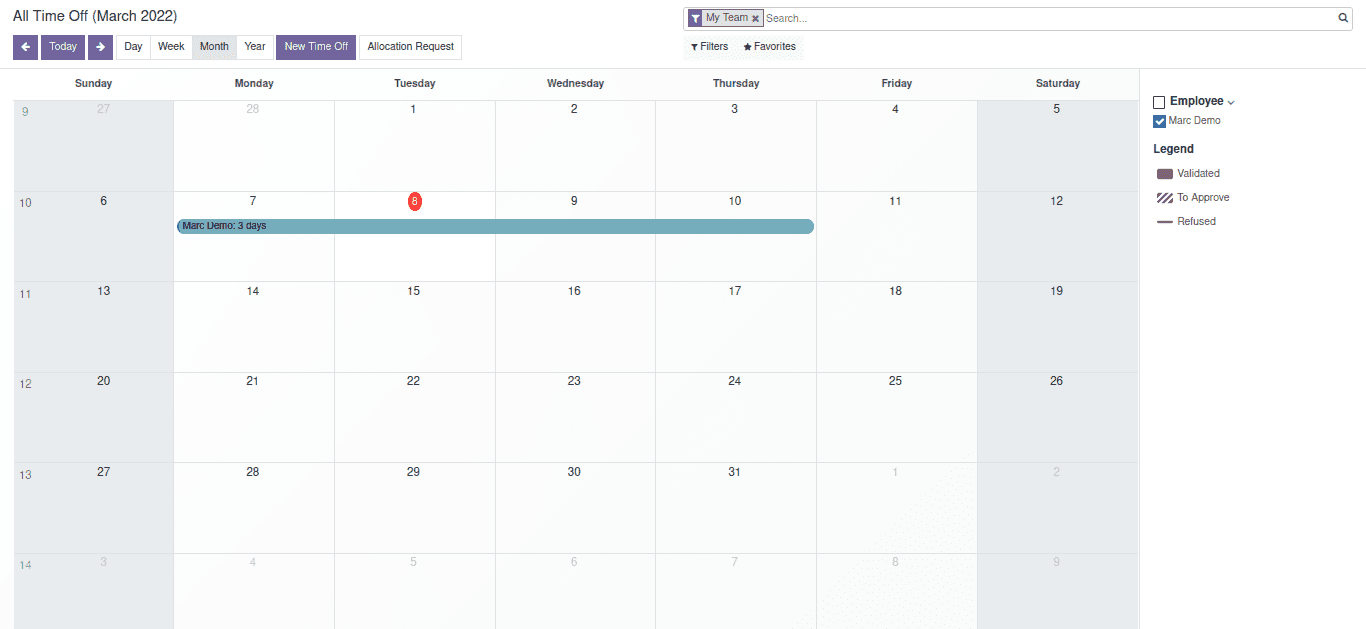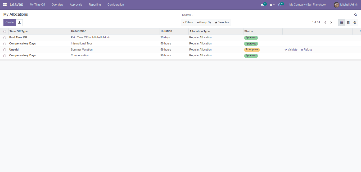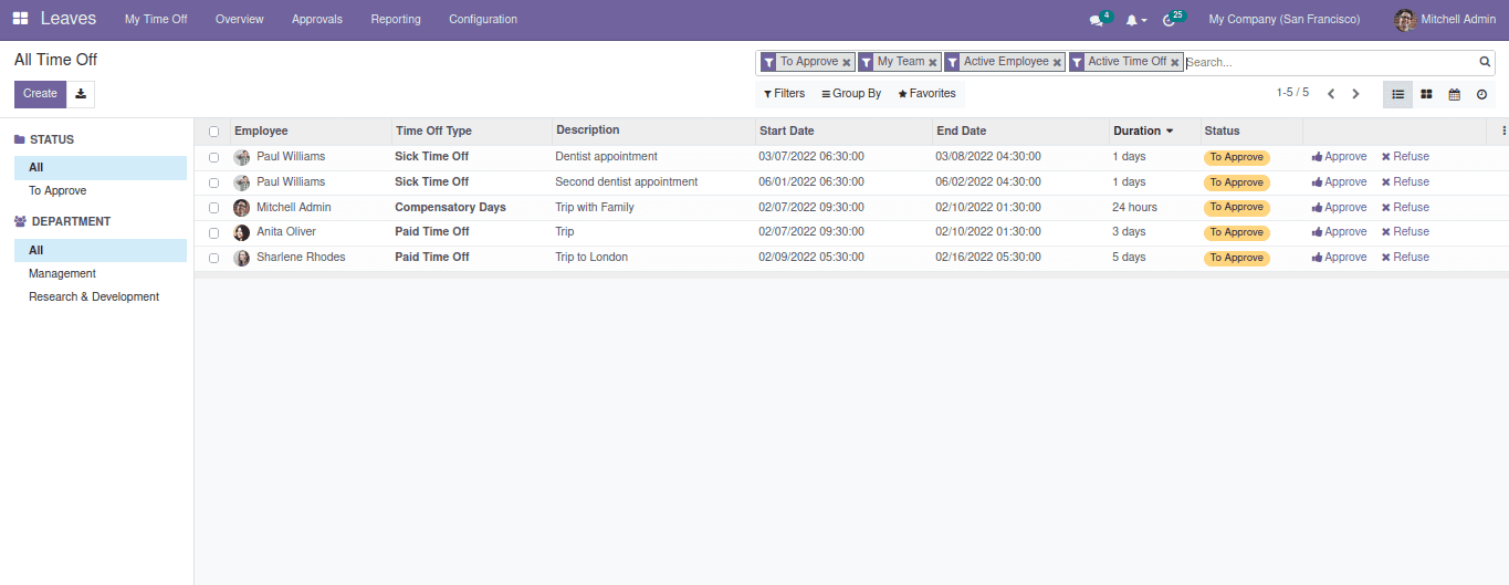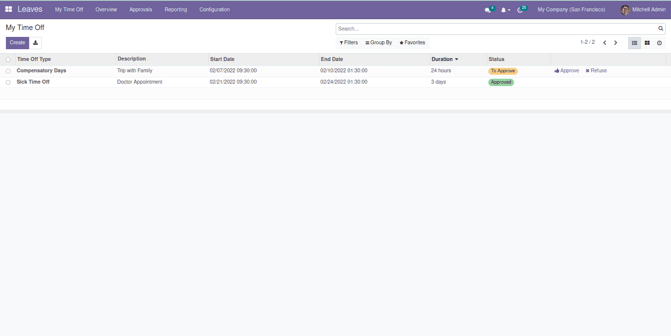 To display all the time off requests created by us, direct to Leaves > My Time Off > My Time Off. It will bring us a list view of time offs we created. And if we are an Approver, we can also see the ‘Approve’ or ‘Refuse’ buttons.