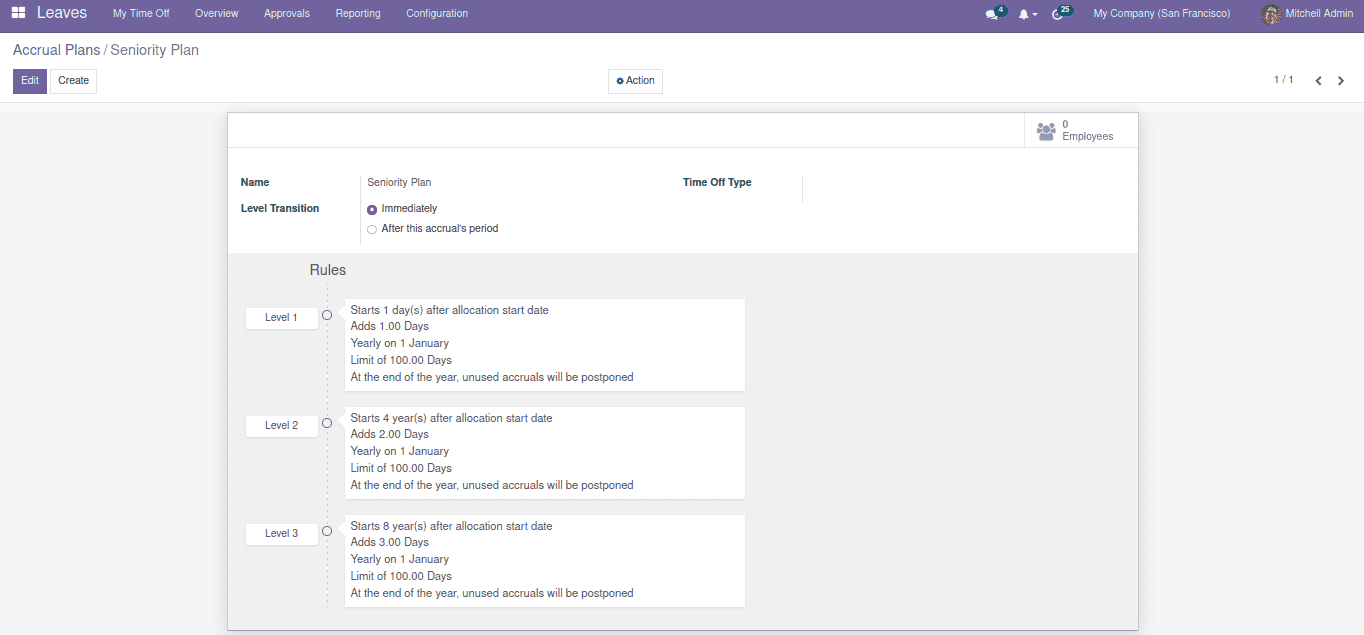 To create an Accrual plan for the employees we can do that from Leaves > Configuration > Accrual Plans.