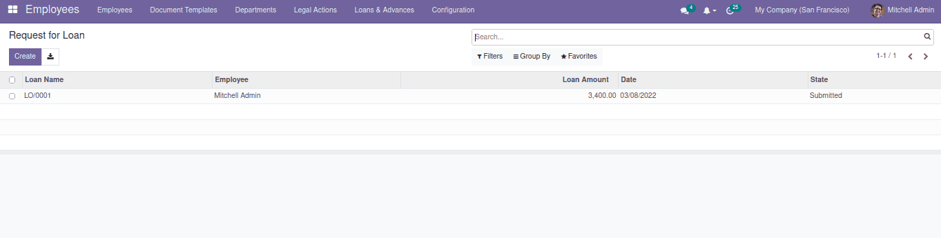 Click on the ‘Create’ button to create a new Loan request. Select the employee and fill in other details such as the loan amount, payment start date etc. Click on the ‘Compute Instalment’ button on the top after specifying the No. of instalments. This will calculate the payment date and the amount to be paid in the below ‘Instalments’ tab. Then we can submit the request and wait for the approval.