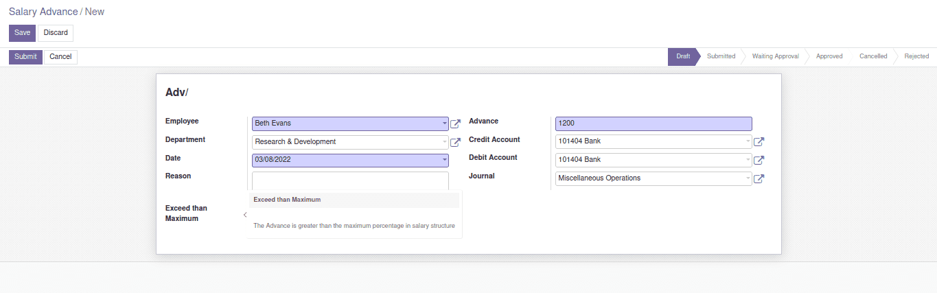 We can request for Salary Advance from Employees > Loans & Advances > Request Salary Advance. Fill in details such as the employee name, Date, Advance amount, reason etc. and then submit for approval.