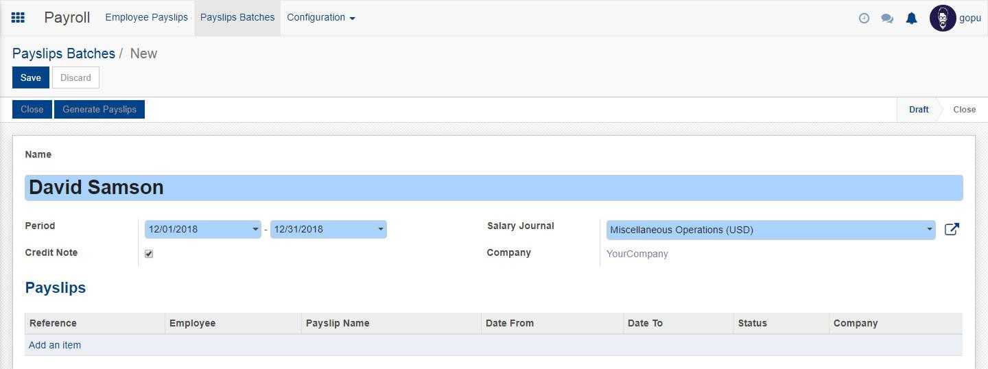 Here in payslip batches you get to see various information like name of the employee, date information, salary journal, credit note and status of the payslip.