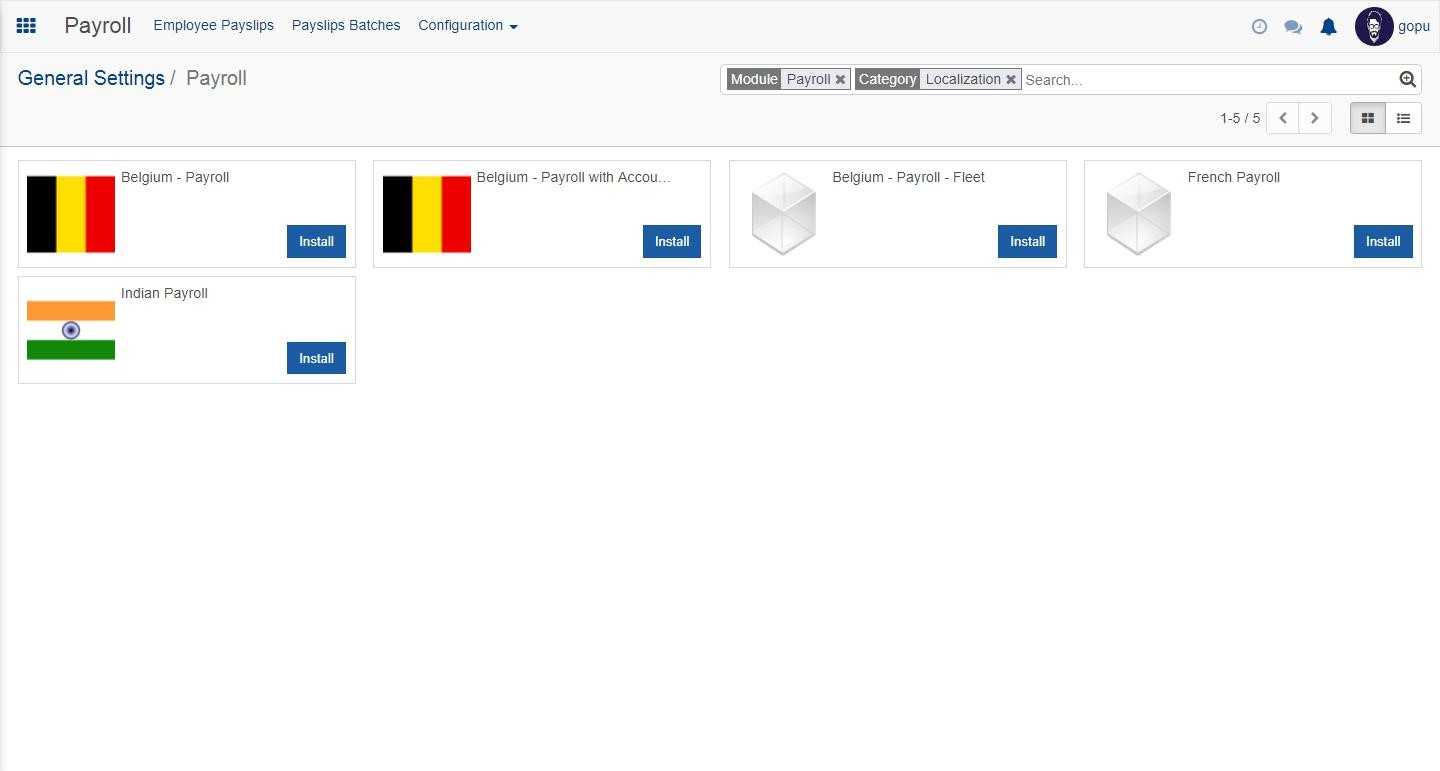 Now if we select the payroll localisation option, payroll systems based on various countries will be shown. You can choose your specific country and select install to install it.
