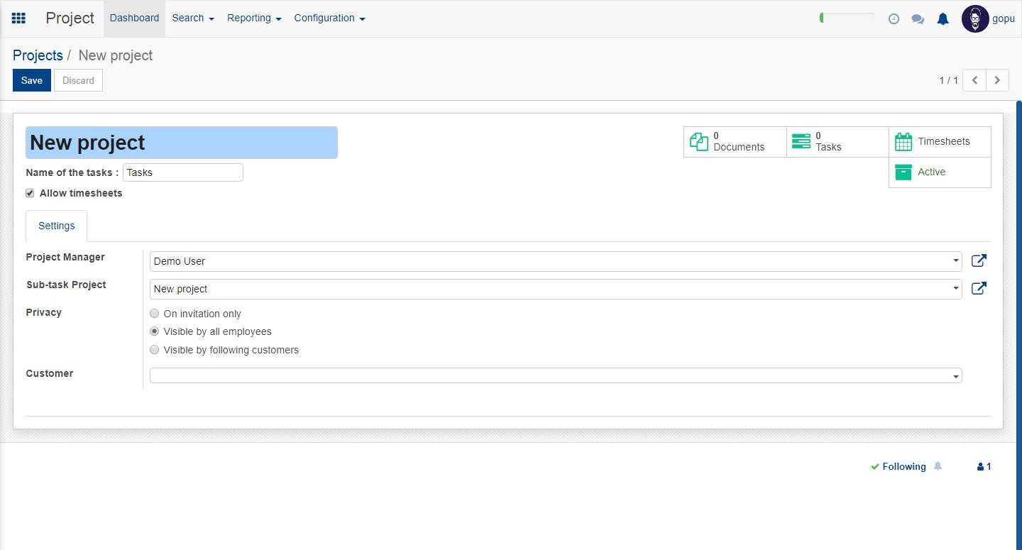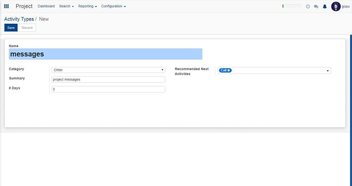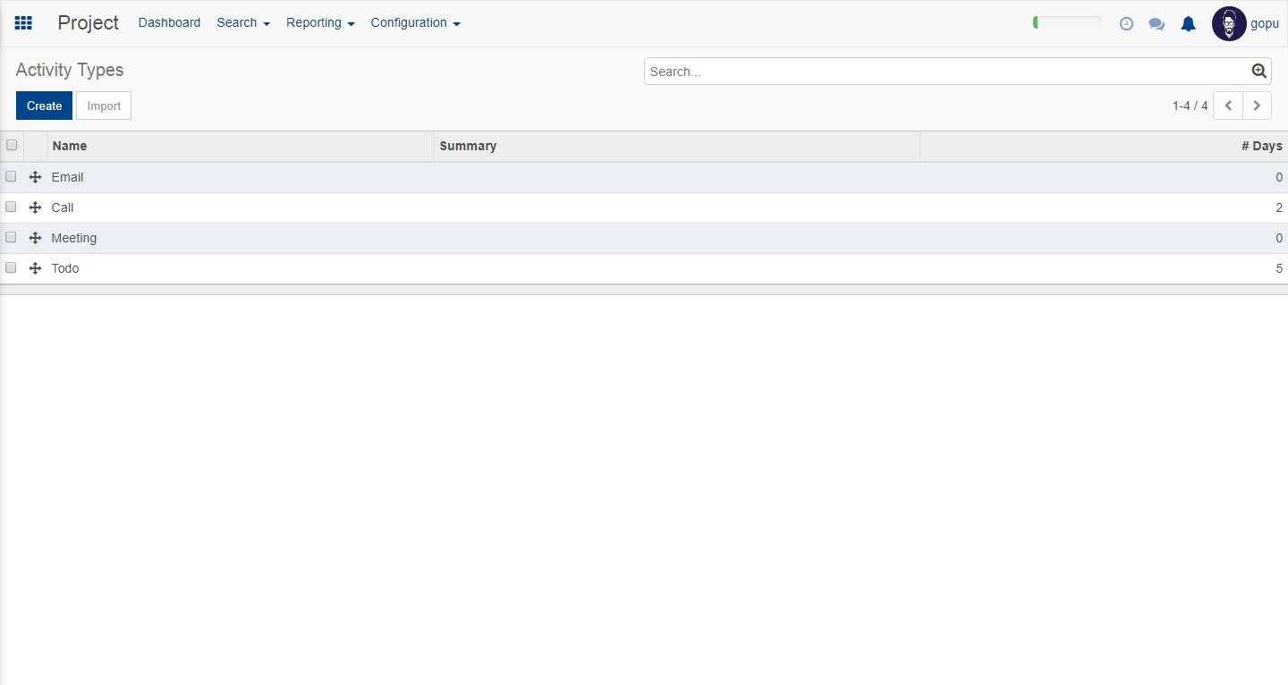In the configuration part we have settings, activity types and projects.