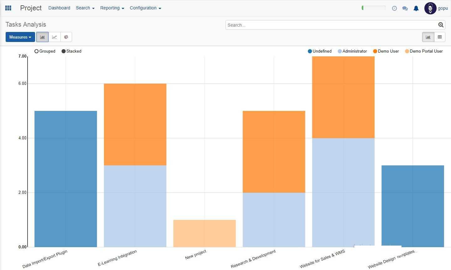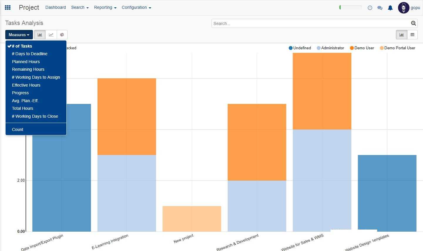 In the reporting option we can see the option called task analysis. This gives the detailed analysis of the various ongoing project in bar graph mode, line graph mode and pie chart model.