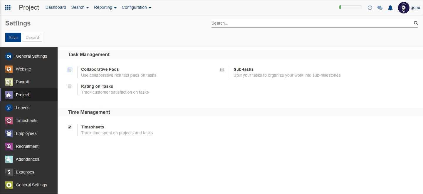 In the settings part of the configuration settings for task management and time management can be done.