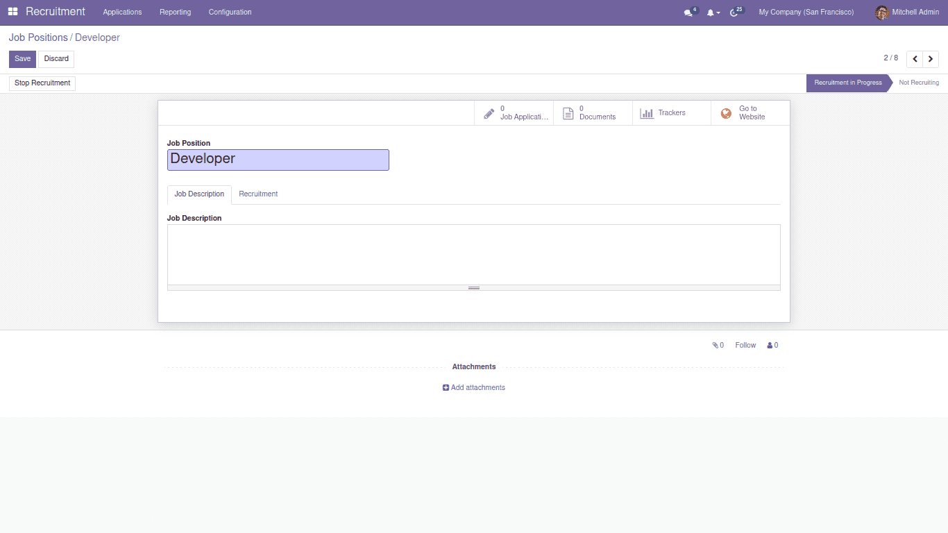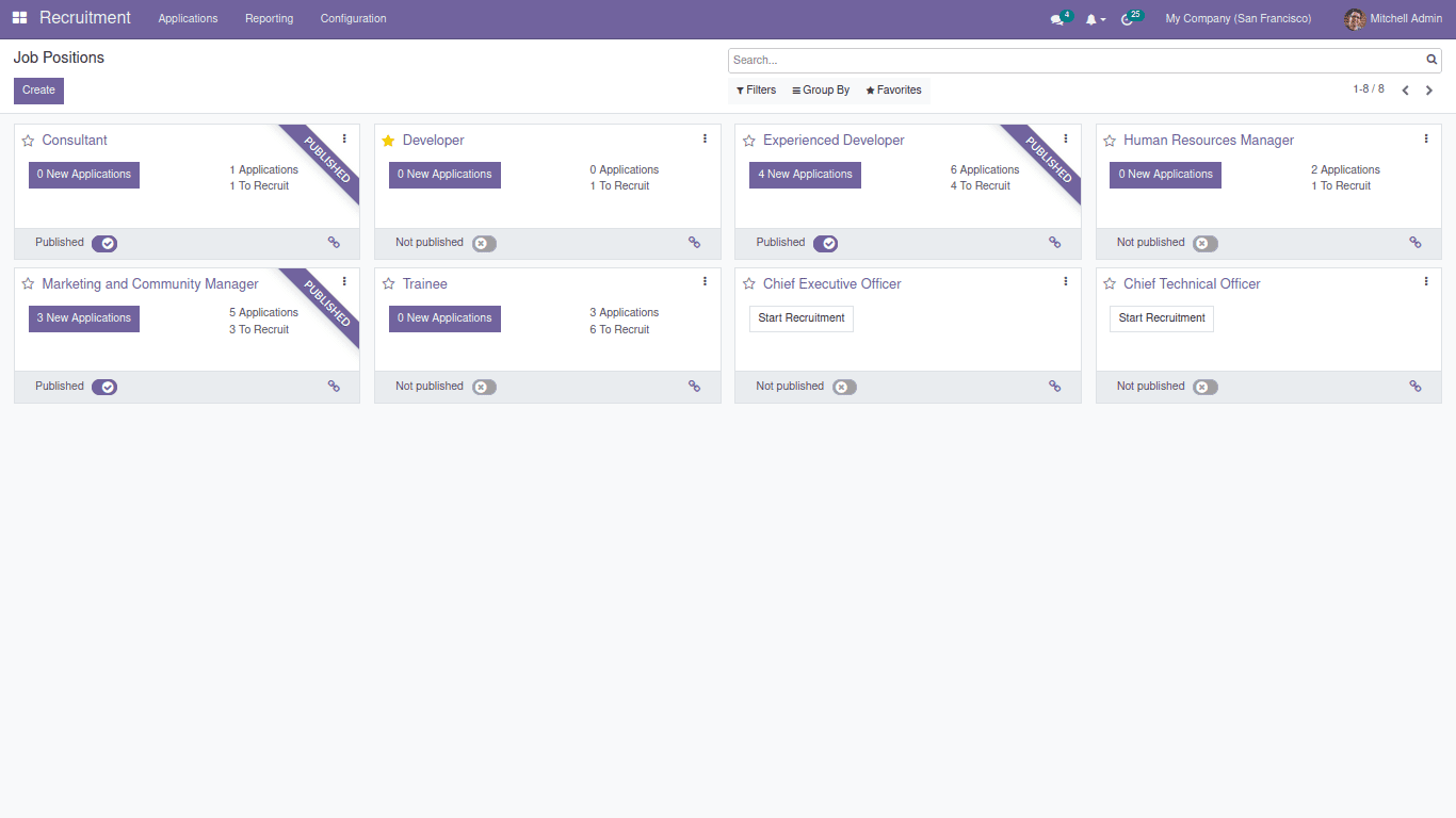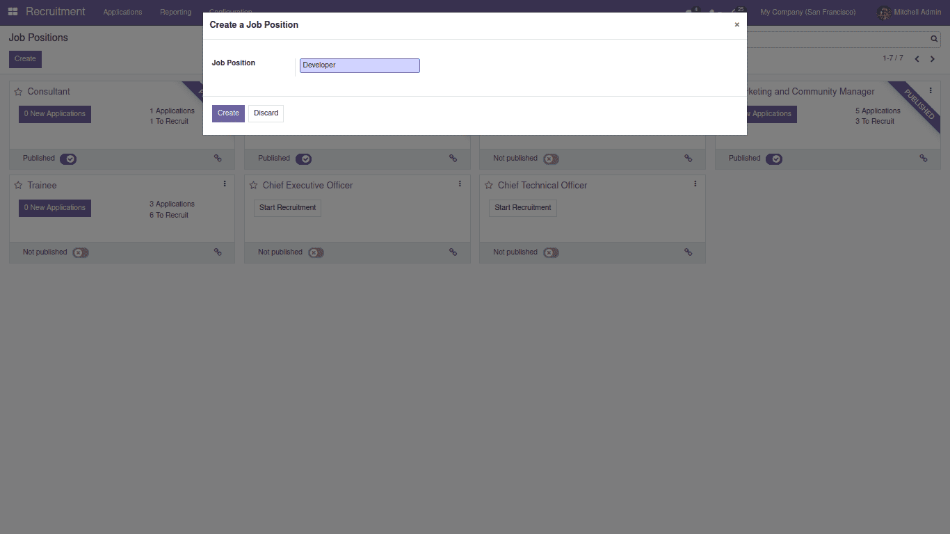Docdil the Recruitment application and it will display all the job positions which have the recruitment process going on. We can simply start a new Recruitment process by creating the Job position using the ‘Create’ button.