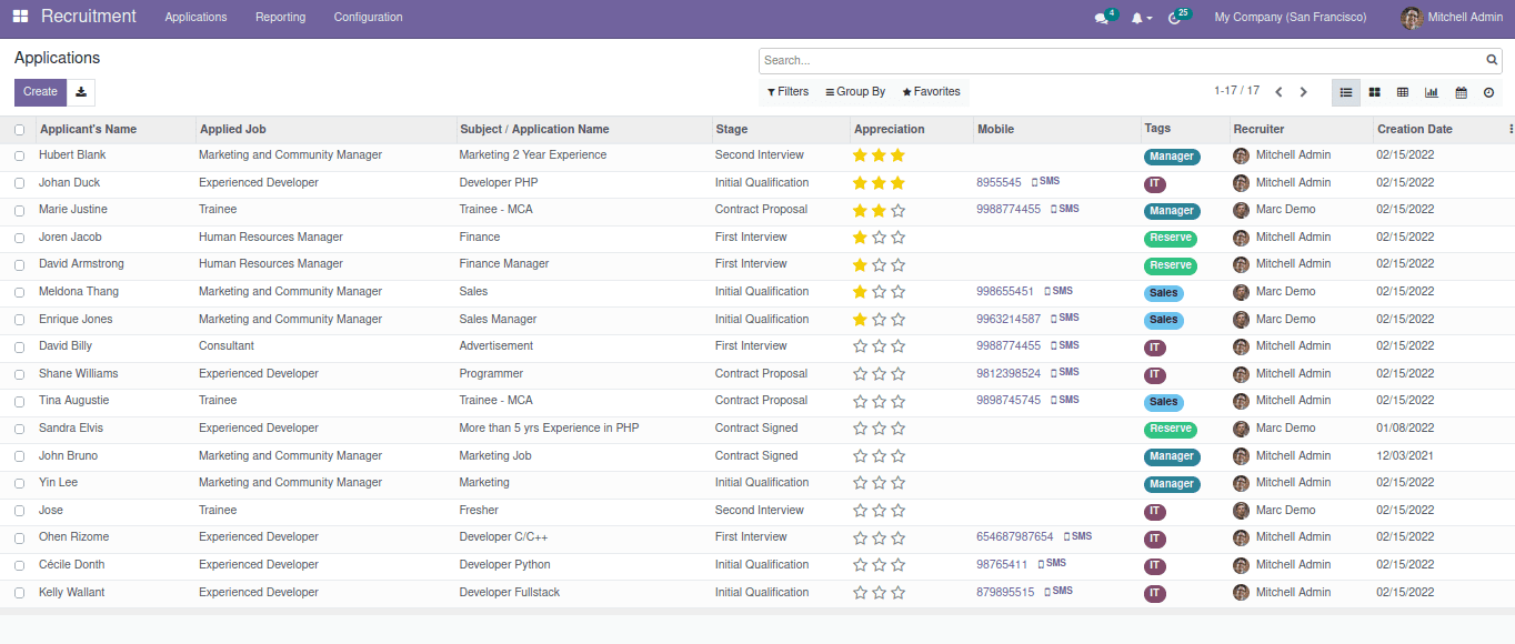 We can list out all of the job applications from Recruitment > Applications > All Applications.
