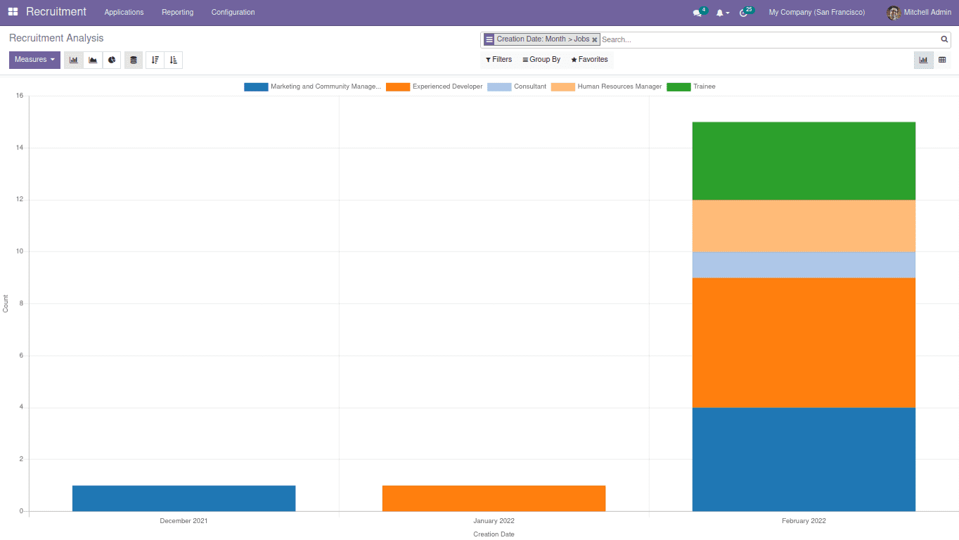 We can navigate to Recruitment > Reporting > Recruitment Analysis to get a graphical and detailed report regarding the recruitment process at the company.