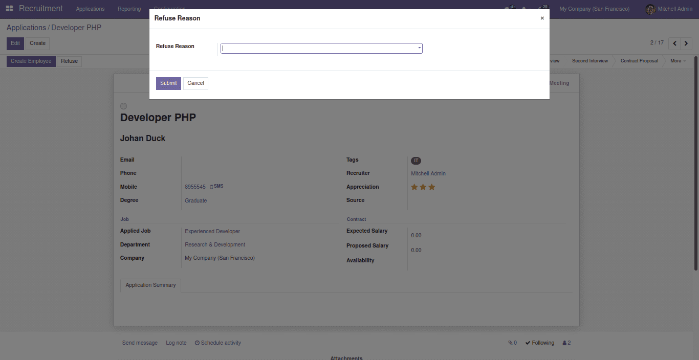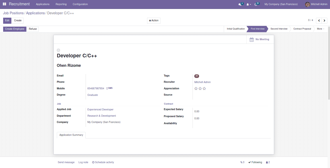 Click on one of the applications to see more information. We can schedule interviews with the applicant and after the final stage, click on the ‘Create Employee’ button to add this applicant as an employee. There is also a ‘Refuse’ button to reject this application.