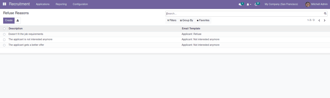 While we click on the ‘Refuse’ button for an application, we have to select a reason for the rejection. This can be configured at Recruitment > Configuration > Refuse Reasons. We have to select the email template also while creating the refuse reason.