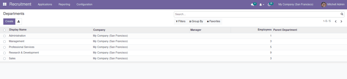 The departments at the company can be configured at Recruitment > Configuration > Departments.