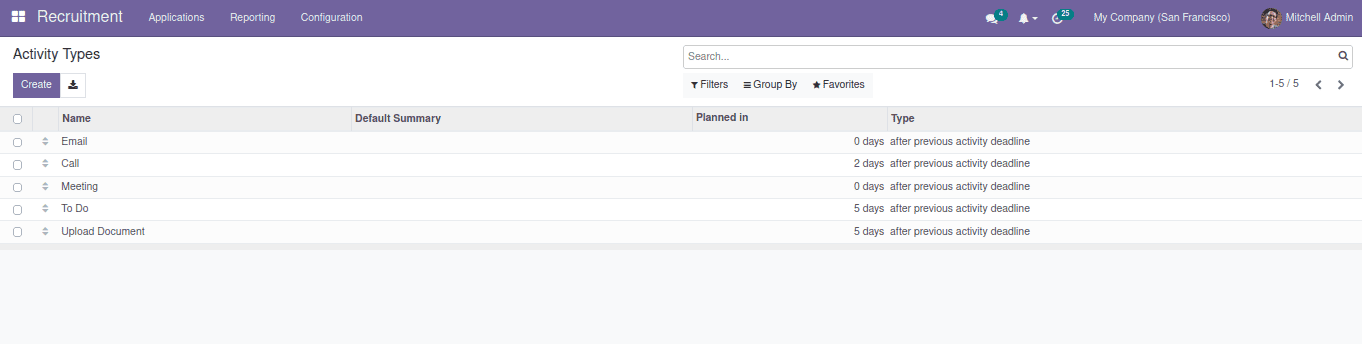 We can schedule different activities for an application such as sending an email, scheduling a meeting etc. from the chatter window of an application. These activities are configured from Recruitment > Configuration > Activity Types.