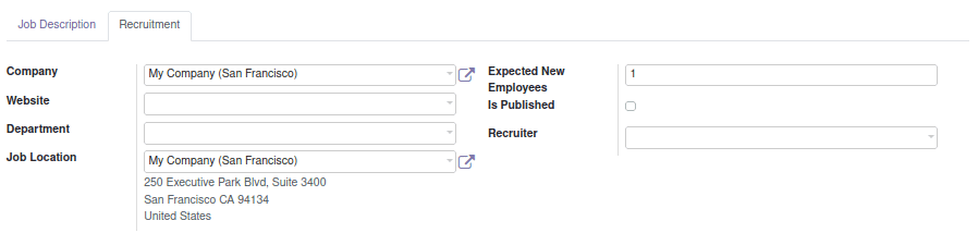 In the ‘Recruitment’ tab you can mention the job location, expected new employees etc.