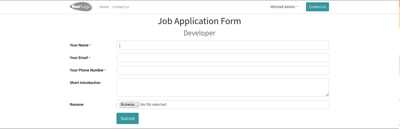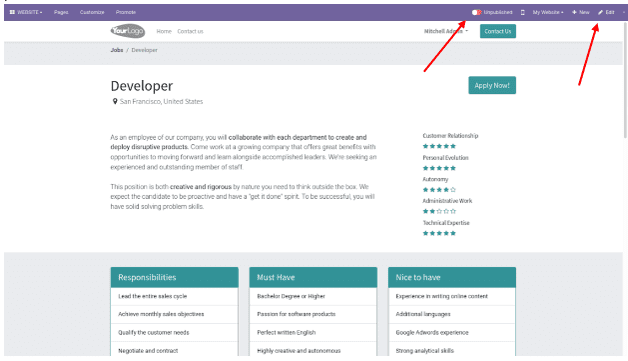 If you click on the ‘Go to Website’ smart button on the top, you can see how the job application will display on the website. You can edit the page using the drag and drop webpage builder and publish.