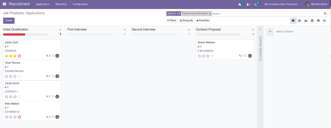 We will receive these applications in the corresponding Job position recruitment record as in the below screenshot. We can move the applications into different stages. These stages are also customisable, we can add/remove new stages as we desire.