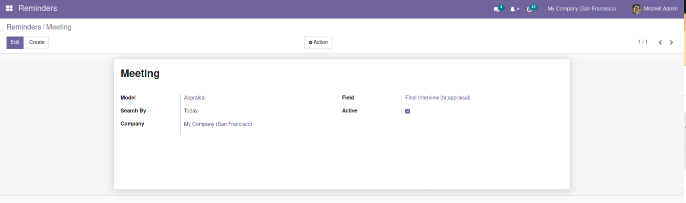 We can simply click on the ‘Create’ button after Docdiling the application, and provide information such as the title, the model name, corresponding date field etc. You also need to specify when you want to search for reminders. We can set a period, a date or we can just search for today.