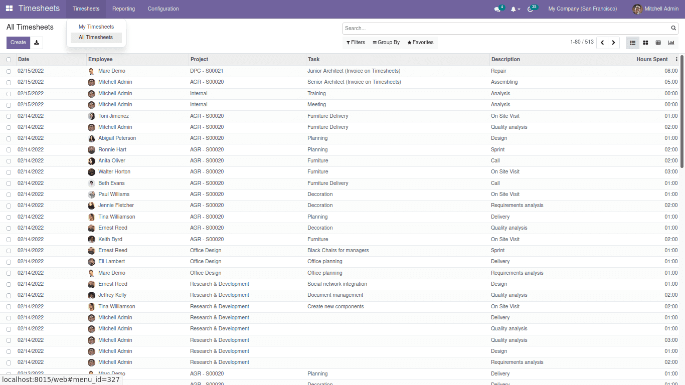 If you are a manager, you can see the timesheets of all employees from Timesheets > Timesheets > All Timesheets