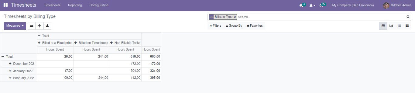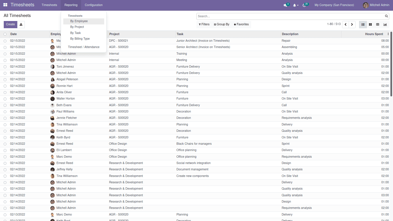 We get a detailed report on the Timesheets from the ‘Reporting’ menu. Reports can be generated based on employees, projects, tasks, or billing types.