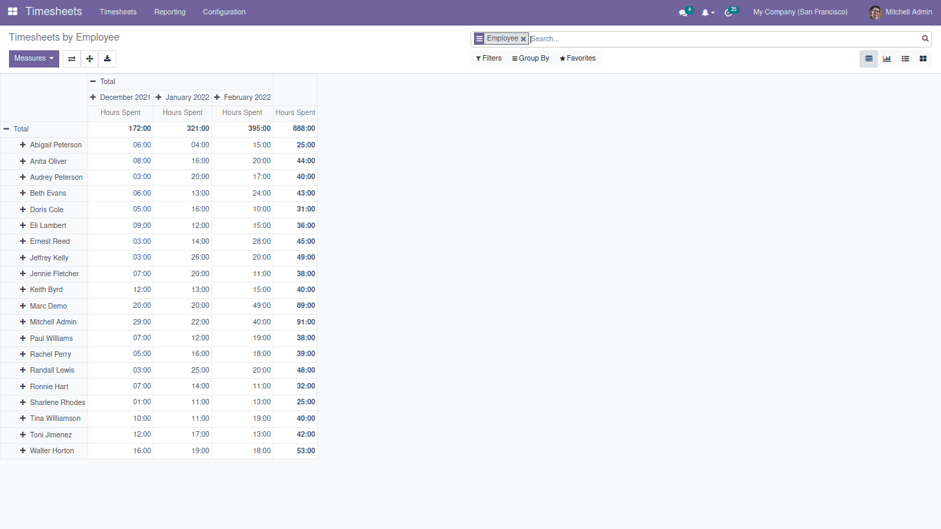 All these reports can be exported to excel sheets. We can get a graphical report on the Attendance from Timesheets > Reporting > Timesheet/Attendance.
