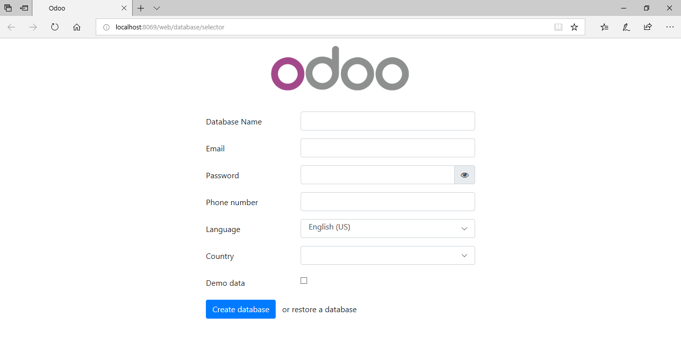 Step 9: After installation Odoo will be automatically opened in the default browser. You can create a new database and go on with further login and the installing of the modules that you prefer.