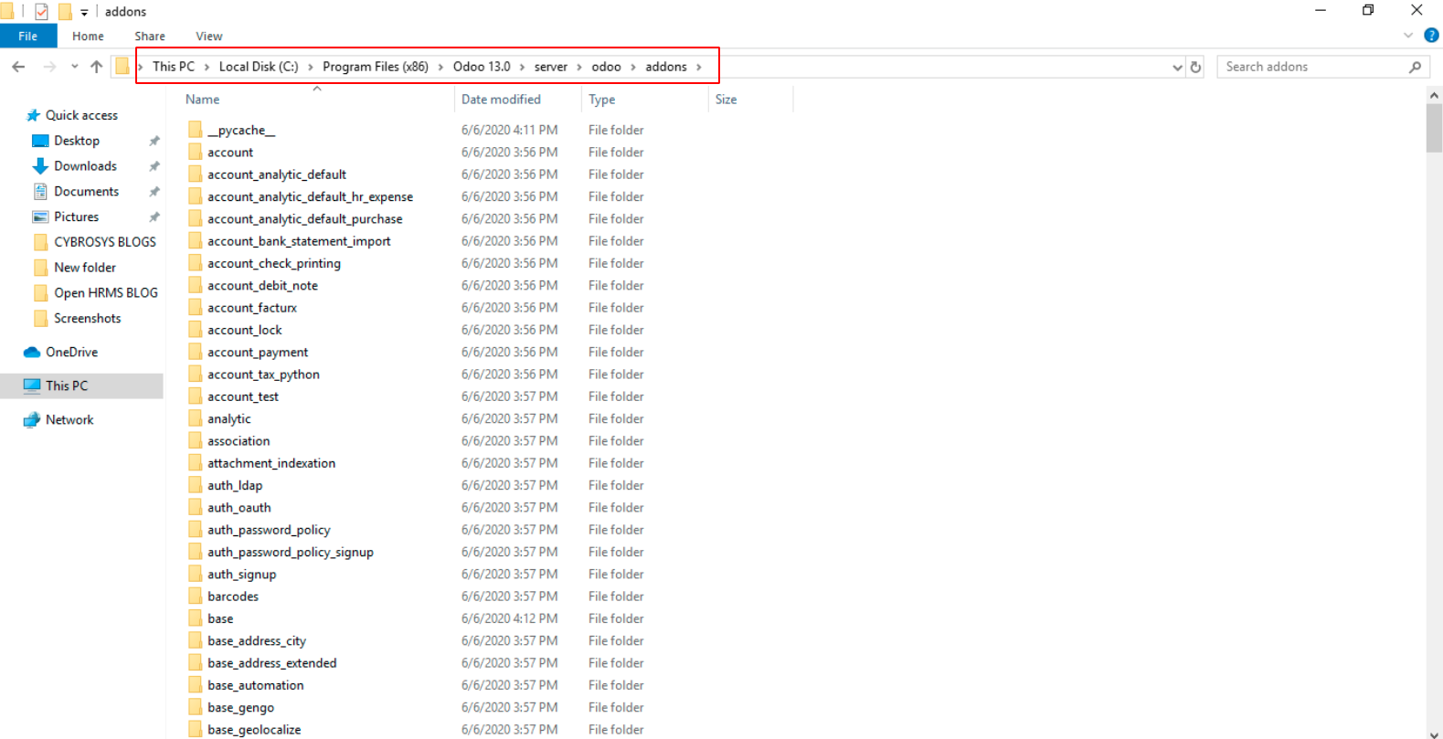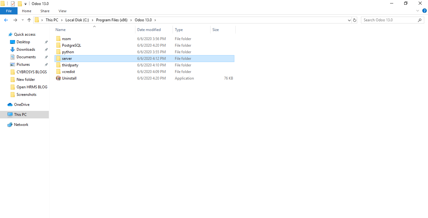 On the flipside in case of Odoo installation for windows the default location of Odoo is in, Local Disk C: -> Program Files (x86) -> Odoo 13.0, which can be further changed based on the need.