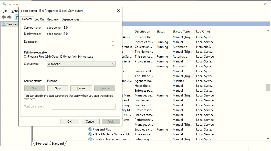 Odoo-server-13.0 is the Odoo service in windows, open the service menu and you can view the window as shown below where you can stop the service and start it again.