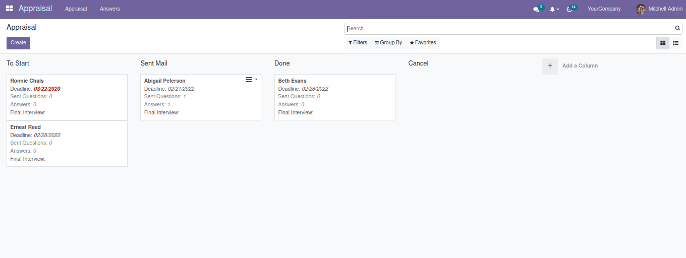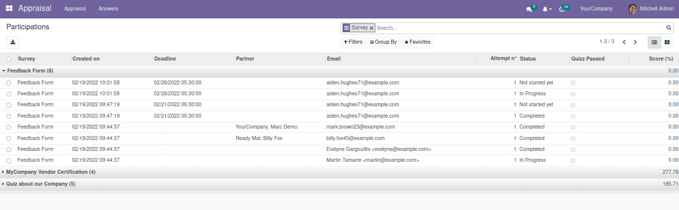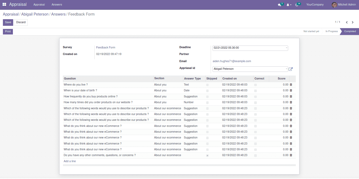 Once the appraisal is sent, each party will receive their respective appraisal forms to fill out. Once done, you can click on the ‘Answers’ smart button to view the answers.