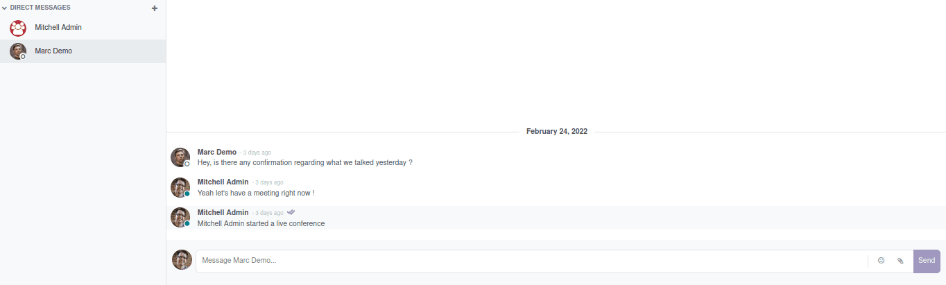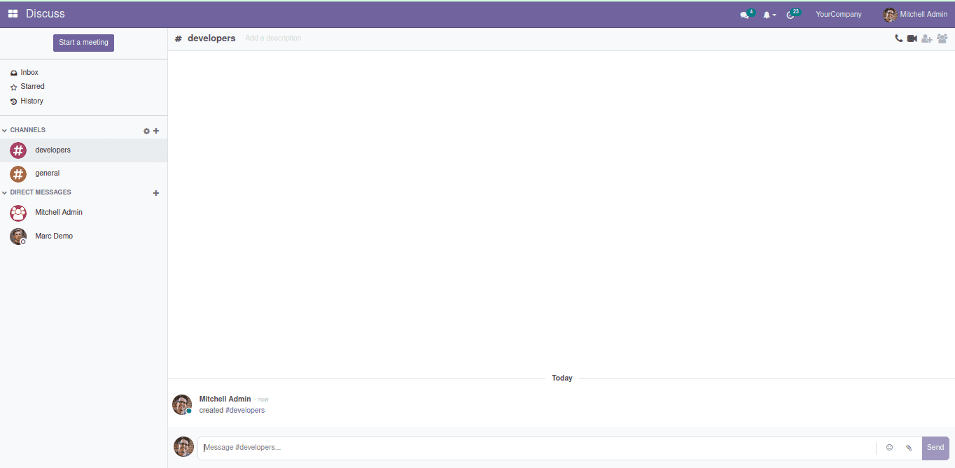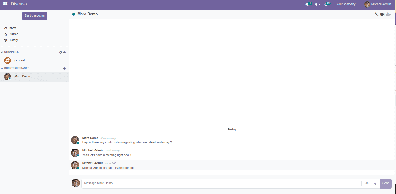 The Discuss app is a discussion platform which operates similar to other most used chat rooms. Here we can send and receive messages. And in the latest version, we can also make a video meeting with the employees using a single click.