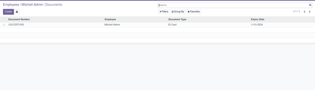 We will get a list view of all of the documents that are related to the employee. To add a new document, just click on the Create button.