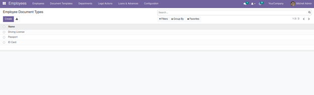 From the Employees > Configuration > Employee Document types menu, we can configure the types of documents.