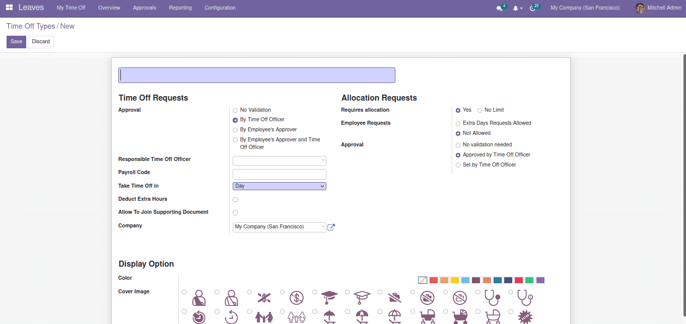 From there we can create a new time off type. We can select the Approval type, Allocation types etc. We can also configure the colour and cover image that need to be displayed in the calendar.