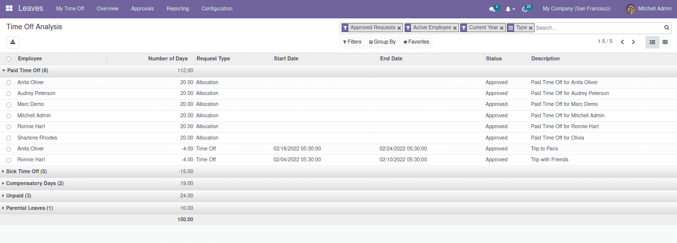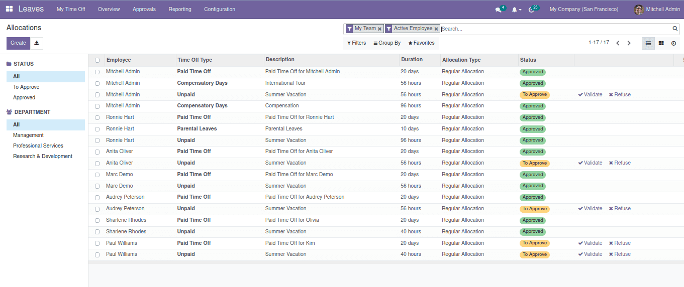 To display all the time off requests created by us, direct to Leaves > My Time Off > My Time Off. It will bring us a list view of time offs we created. And if we are an Approver, we can also see the ‘Approve’ or ‘Refuse’ buttons.