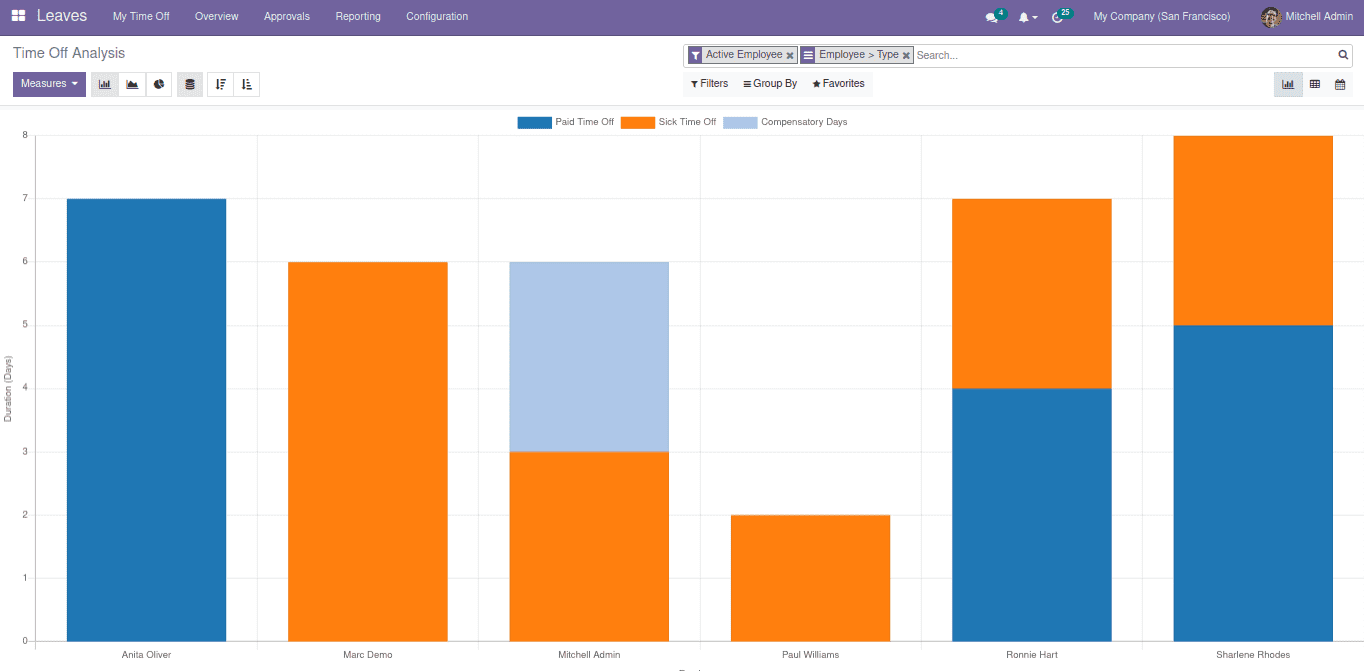 We can get a detailed report regarding the employee leaves from Leaves > Reporting > By Employee. There we have Bar chart, Line chart and Pie chart views. We can also make use of the pivot view which can be selected from the top right corner to export the detailed reports.