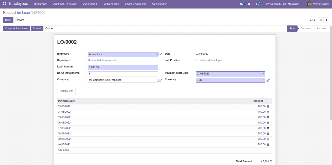 Click on the ‘Create’ button to create a new Loan request. Select the employee and fill in other details such as the loan amount, payment start date etc. Click on the ‘Compute Instalment’ button on the top after specifying the No. of instalments. This will calculate the payment date and the amount to be paid in the below ‘Instalments’ tab. Then we can submit the request and wait for the approval.