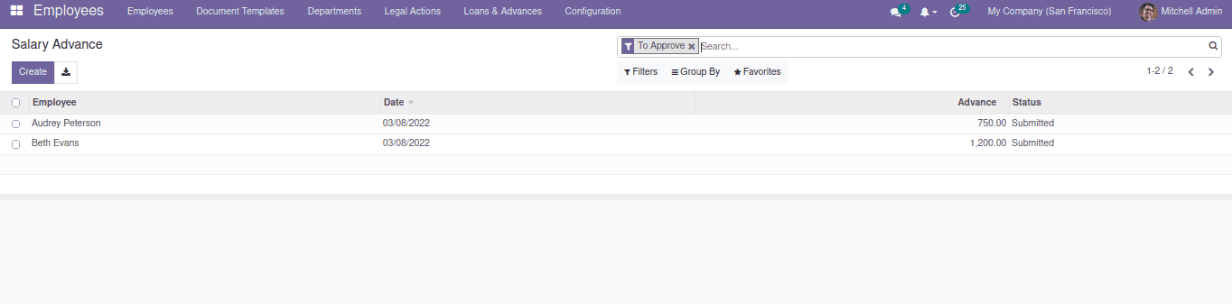Salary advances to be approved can be found from Employees > Loans & Advances > Salary Advance to Approve.