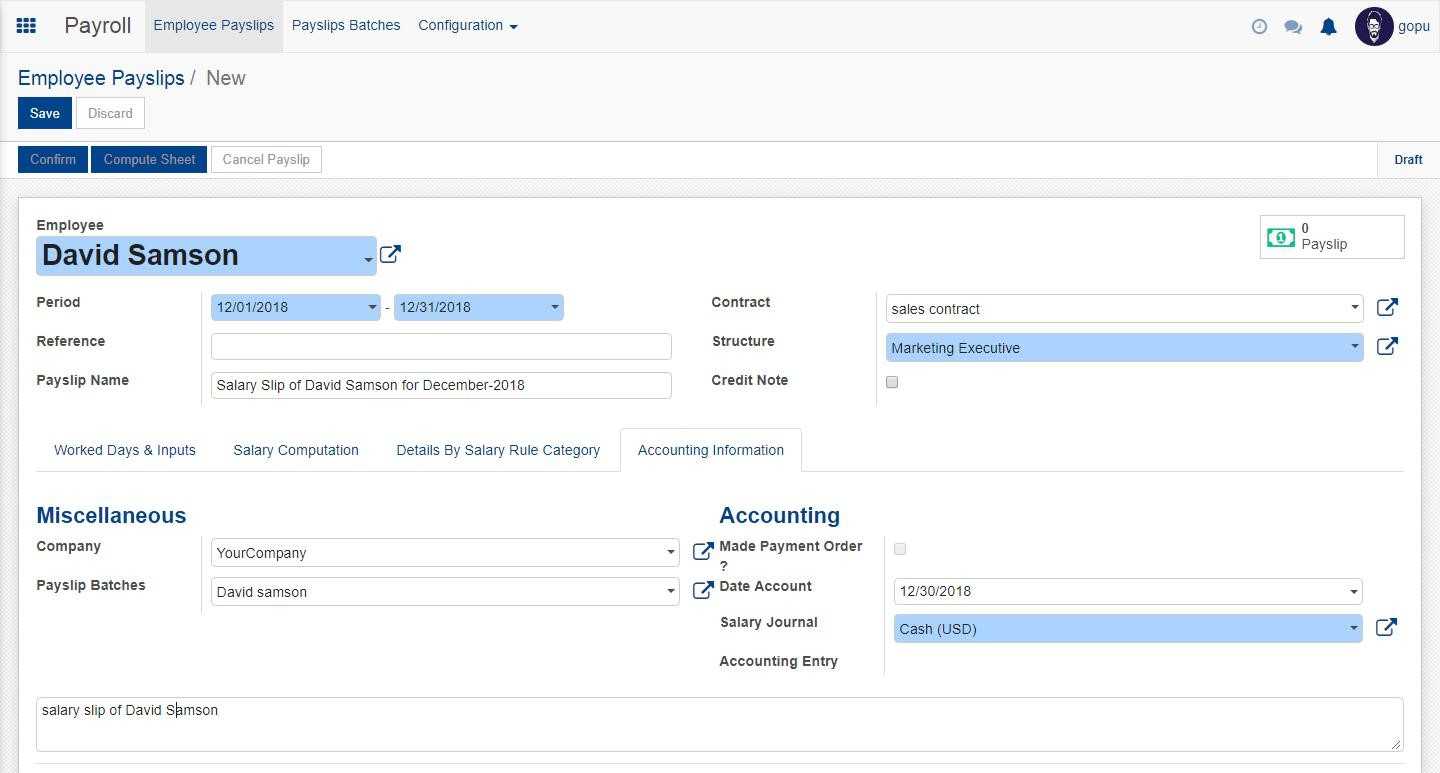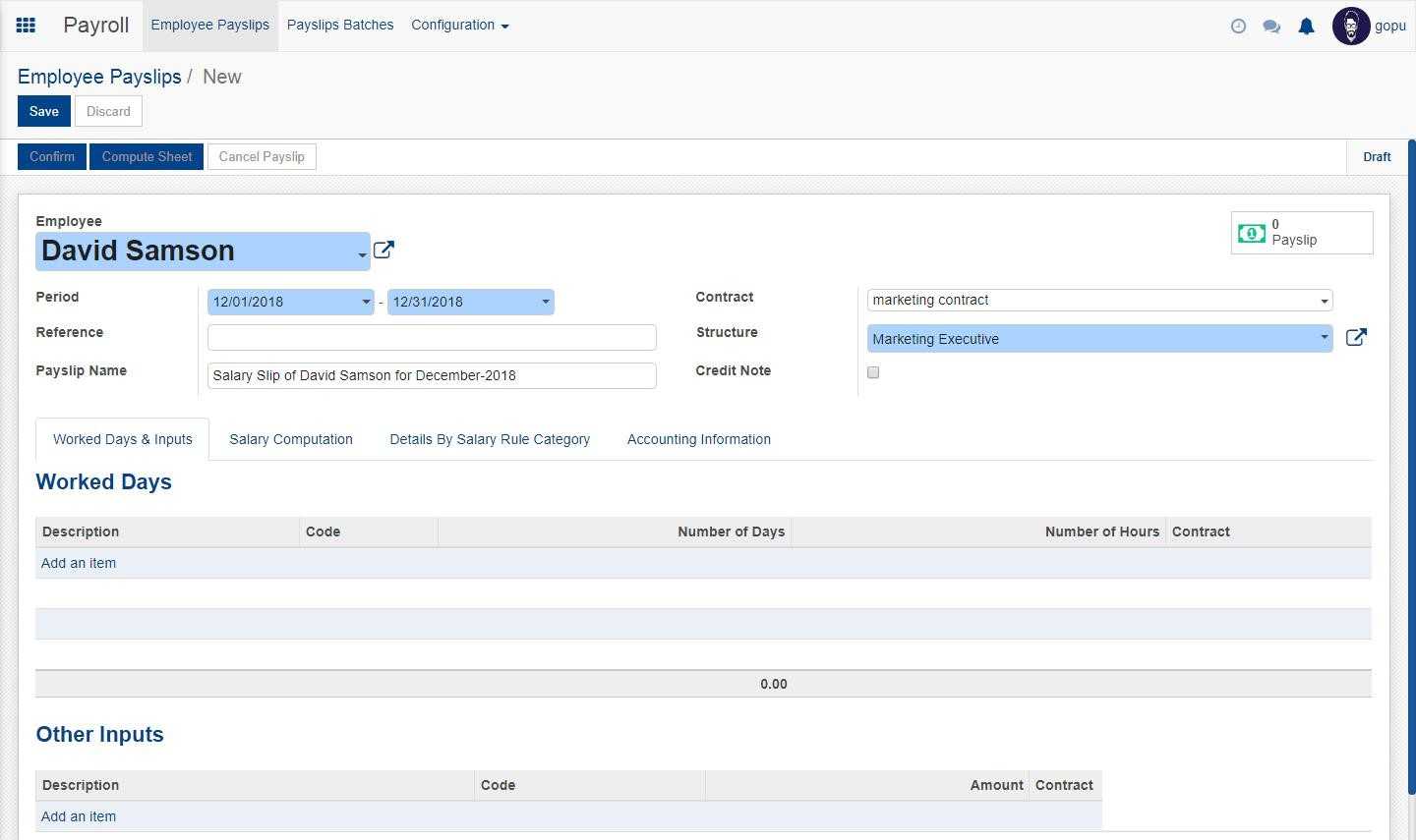 Now there are three options before saving. We can either confirm the payslip, compute sheet or cancel the payslip. If we click on confirm, the payslip will be created and to save it click on save.