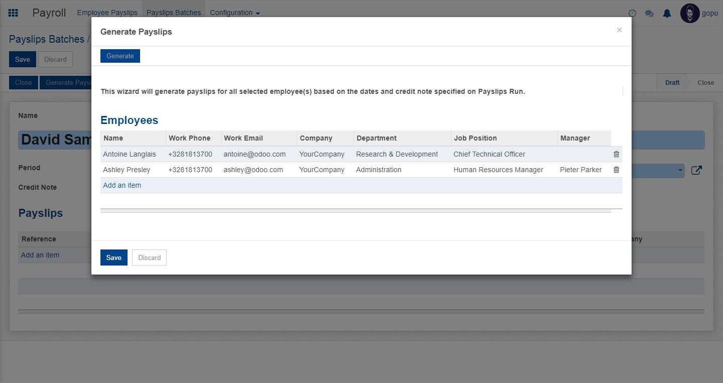 In the employee payslip, you can get various details like employee name, payslip name, dates, company and status of the payslip.