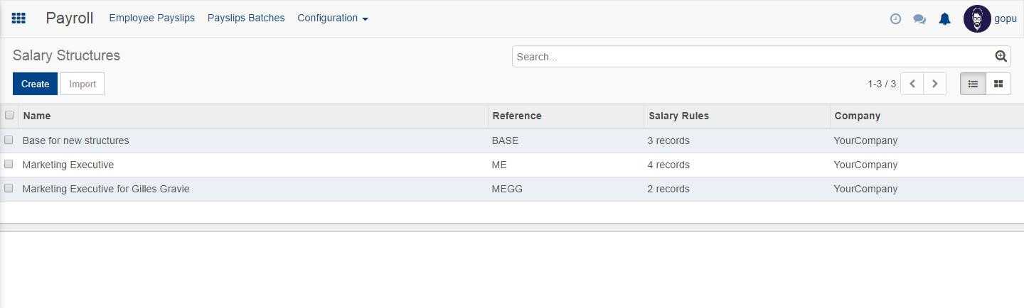 Here you can see the various salary structures along with their reference, salary rules and company. To create a new salary structure click on the create button;