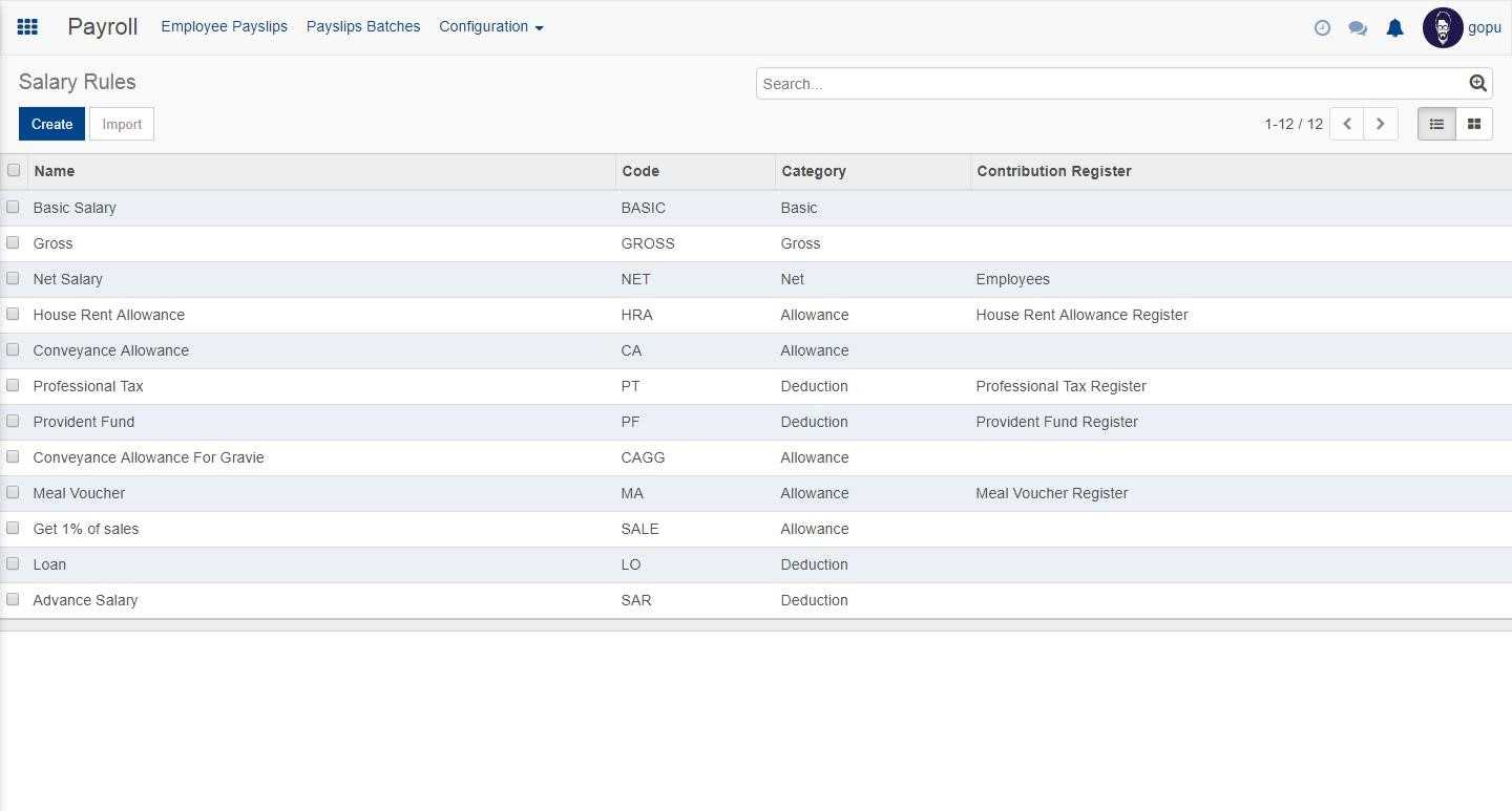 In the configuration part we have options for settings, salary structure, salary rules, contribution registers and contract advantage templates.