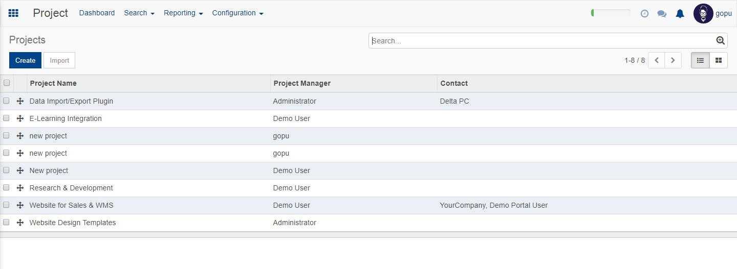 Now if you take the project option from the configuration menu, then you get to see all the project happening along with the assigned project managers and contact. This is shown in the below screenshot.