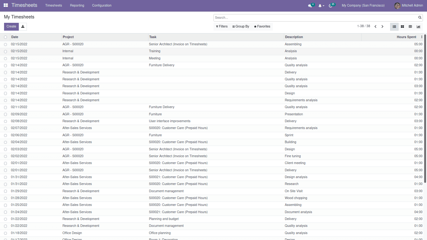 Docdil the timesheet application to see the list view of your recorded timesheets. Click on the ‘Create’ button to record a new timesheet. It will create a new entry right in the list view and we can set the date, project and task details, description of the task and finally the hours spent on the task.