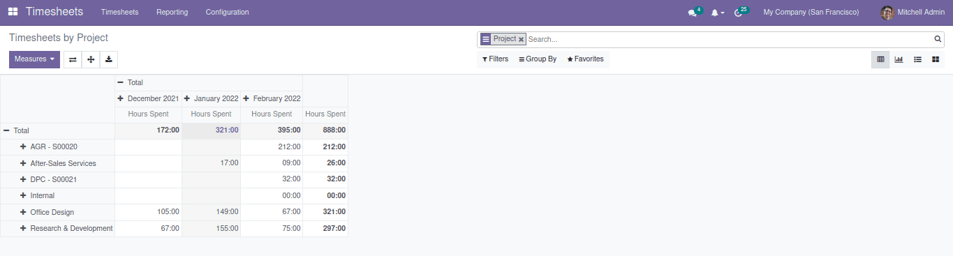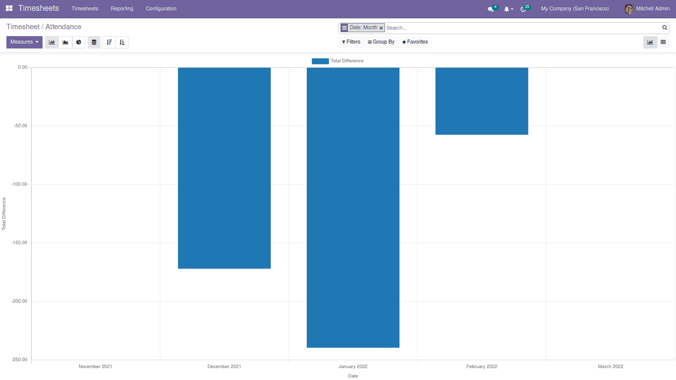 All these reports can be exported to excel sheets. We can get a graphical report on the Attendance from Timesheets > Reporting > Timesheet/Attendance.